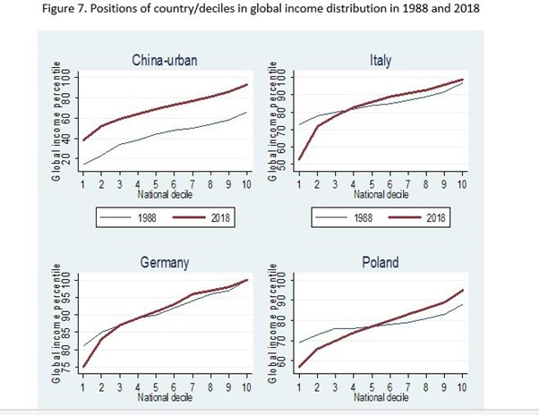 The income divergence that Milanovic observes in Western societies is not as marked in the fastest-growing major economy at the heart of global convergence: China. Since the end of the Cold War the bandwidth of urban Chinese incomes moved substantially up the global distribution. whereas it ran from the 18th to the 66th percentile in 1988, some thirty years later it had ratcheted up the ladder from the 39th to the 93rd percentile. Rich Chinese citizens improved their lot more than poor ones, which is consistent with the widening of intra-national income inequality in China since the Reform and Opening Up period began. But despite China spanning a very large section of global outcomes, even the poorest Chinese have undeniably become substantially better off.
